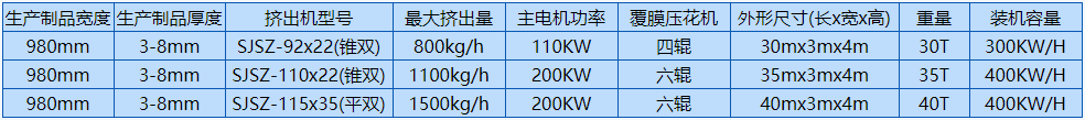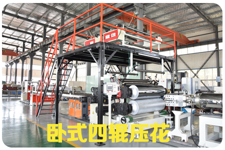 SPC石塑地板生產線,由擠出機、模具、四輥成型機、冷卻系統、牽引機、新一代精加工自動定長切割機、自動成品卸料臺等組成,全自動化控制。SPC石塑地板由擠出機擠出PVC的基材,用四輥壓延機組,分別把PVC彩膜+PVC耐磨層+PVC底膜,一次性壓貼復合而成的產品,工藝簡單、貼合靠熱量完成,不含膠水。在由擠出機擠出,在線實現表面覆膜工藝后,再經過多片鋸分切(因為長度已經固定,只需要縱向多片鋸),然后縱橫向開槽,再表面油漆UV(一般做兩個道)最后包裝入庫。
