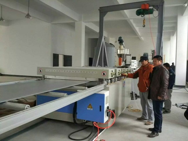 該條生產線是我公司根據德國技術和國內發泡制品業特點獨立研發,由錐形雙螺桿擠出機,板材模具,定型臺,冷卻托架,牽引機,切割機,機械手等部分組成。擠出機采用專門設計的螺桿,生產線全部采用進口電器,如西門子電機,ABB變頻器,歐姆龍溫控表,施耐德等品牌,性能卓越,能夠長時間無故障運行。